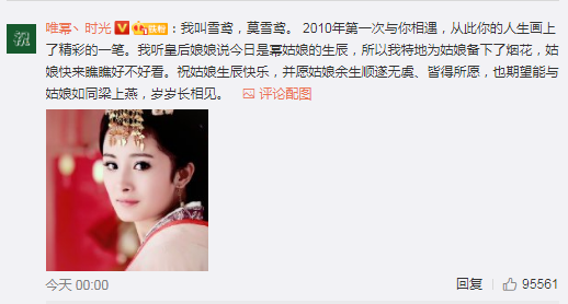 今天,在杨幂生日的时候,粉丝们在微博留言区,悄悄的写下了,想对大幂幂说的话,用粉丝头像连成了一句生日祝福:祝杨幂9月12日生日快乐,寻寻幂幂,不离不弃,蜜蜂永远为狐狸撑起一片天。除此之外,还收集了杨幂这些年来饰演过的经典角色,用每个角色的口吻,来送上对杨幂的生日祝福,感谢每一次的遇见。