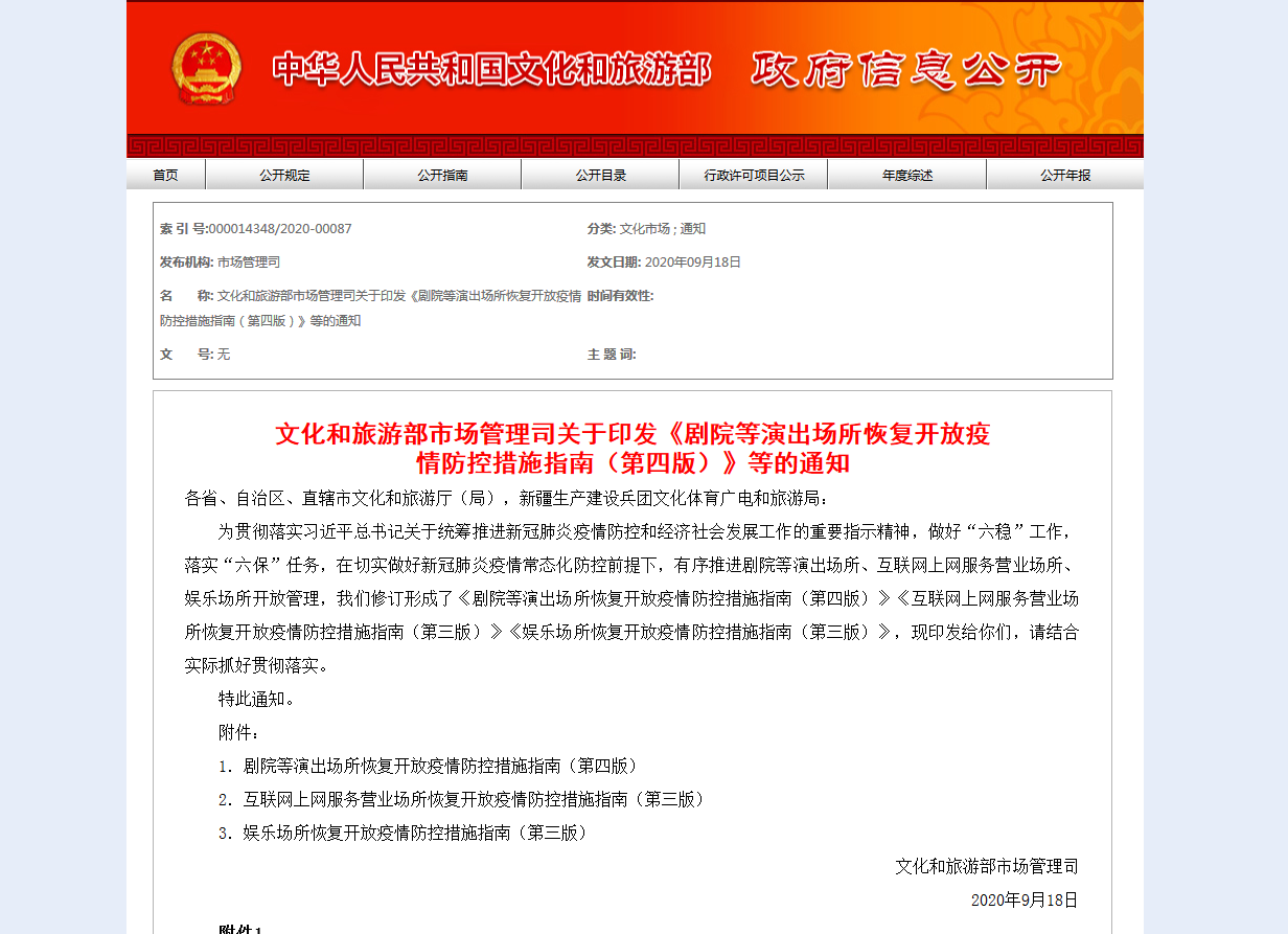 9月18日,文旅部发布了《剧院等演出场所恢复开放疫情防控措施指南(第四版)》。