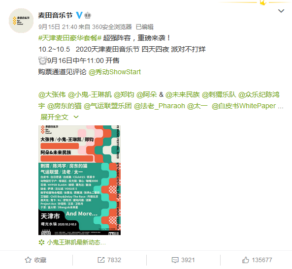 在9月15日,天津麦田音乐节官方公布了首波演出阵容。