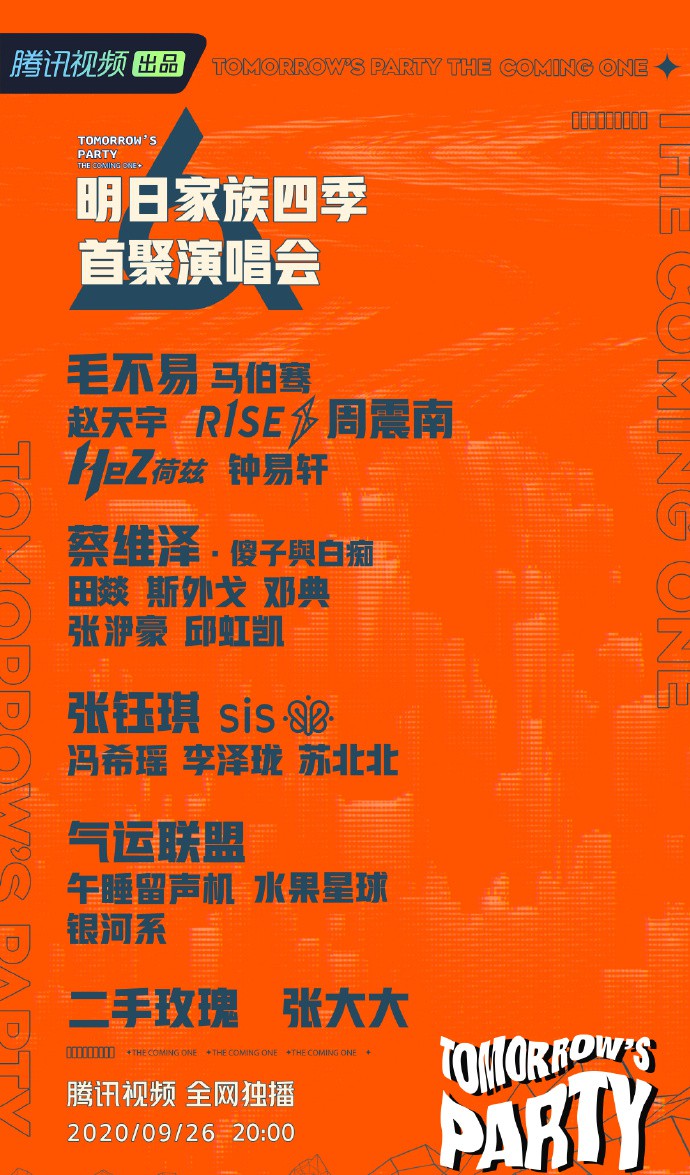 9月21日中午,腾讯视频《明日之子》两大官博同时官宣明日家族四季首聚演唱会的嘉宾阵容,四季厂牌前三名,除了水晶时代的BY2外,全员到齐,这也是明日之子首次聚集四季前三甲。