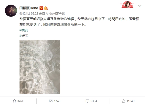9月24日,原SHE组合中的Hebe田馥甄的微博发文,引发了很多人的关注。微博中,田馥甄在原文里写道:“整个夏天都还没来得及跳进游泳池里,秋天就这样到来了。时间用奔的,眼看预产期就要到了,临盆前先跳进澡盆放松一下。”
