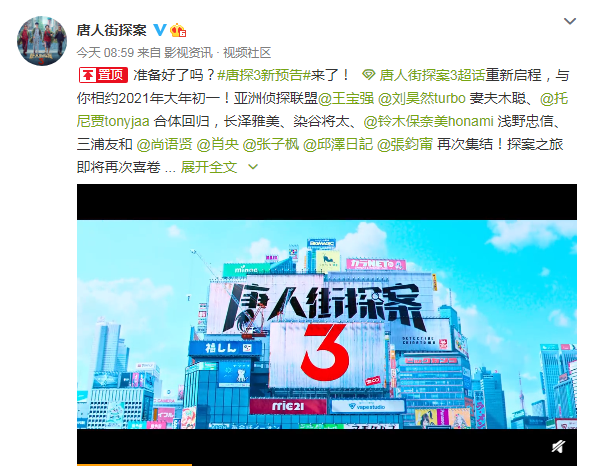 今天官博在发布定档信息的同时,还发布了全新的预告片,看完今天的预告,你有没有对将于今年大年初一上映的《唐人街探案3》,更加期待呢?赶快约好你的小伙伴,大年初一一起到电影院观影吧!