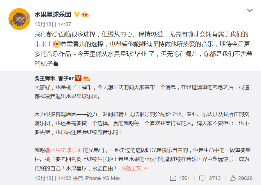 13日下午,水果星球乐团的成员王舜禾微博发文称,因为自己的能力、时间和精力无法很好的分配给学业、专业、乐队以及自己所在的交响乐团,所以在慎重考虑之下,选择退出水果星球乐团。