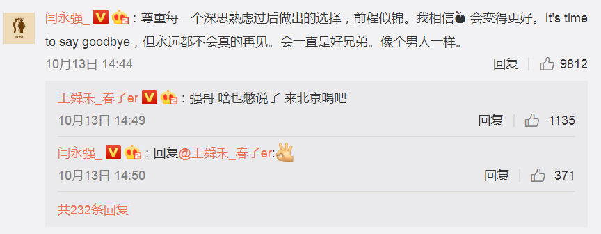 闫永强:尊重每一个深思熟虑过后做出的选择,前程似锦。我相信桃子会变得更好。It's time to say goodbye,但永远都不会真的再见。会一直是好兄弟。像个男人一样。