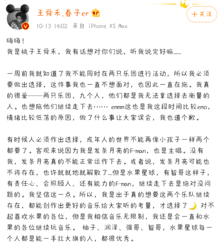 从王舜禾发布的长文章中,我们可以看到,现阶段,王舜禾同时在进行发条月亮和水果星球两个乐团的活动,他还要分给学业、专业一部分时间,另外还有交响乐团需要兼顾,在多重影响因素的权衡之下,王舜禾选择了退出水果星球乐团。