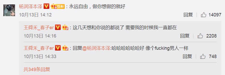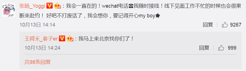 张旸:我会一直在的!Wechat电话我会随时接线!线下见面工作不忙的时候也会很果断来赴约! 好吧不打废话了,我会想你,要记得开心my boy。