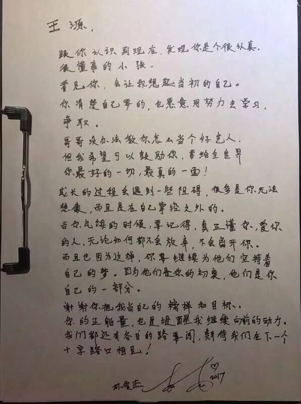 录制《王牌对王牌》的时候,有一次节目组要求嘉宾们给自己想要联系的人写一封信。当时小王源就给JJ林俊杰写了一封信,没想到的是,这封信不仅被送到了林俊杰本人手中,而且王源还收到了JJ本人的回信。